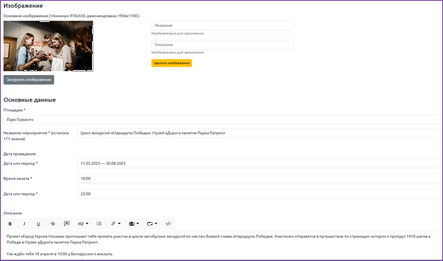 Раздел предназначен для создания управления мероприятиями, их публикации, привязки к тематическим разделам, а также привязки к ним связанных с ними материалов (фото галереи, видео галереи, новости и т.д.).